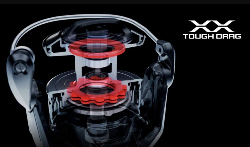 - ドラグワッシャー面積が約4倍に 従来はスプール下部のみだったドラグワッシャーを、スプール上部にも配置(専用カーボンワッシャー)。これにより、摩擦を受け止める面積が前作比で約4倍に拡大しました。